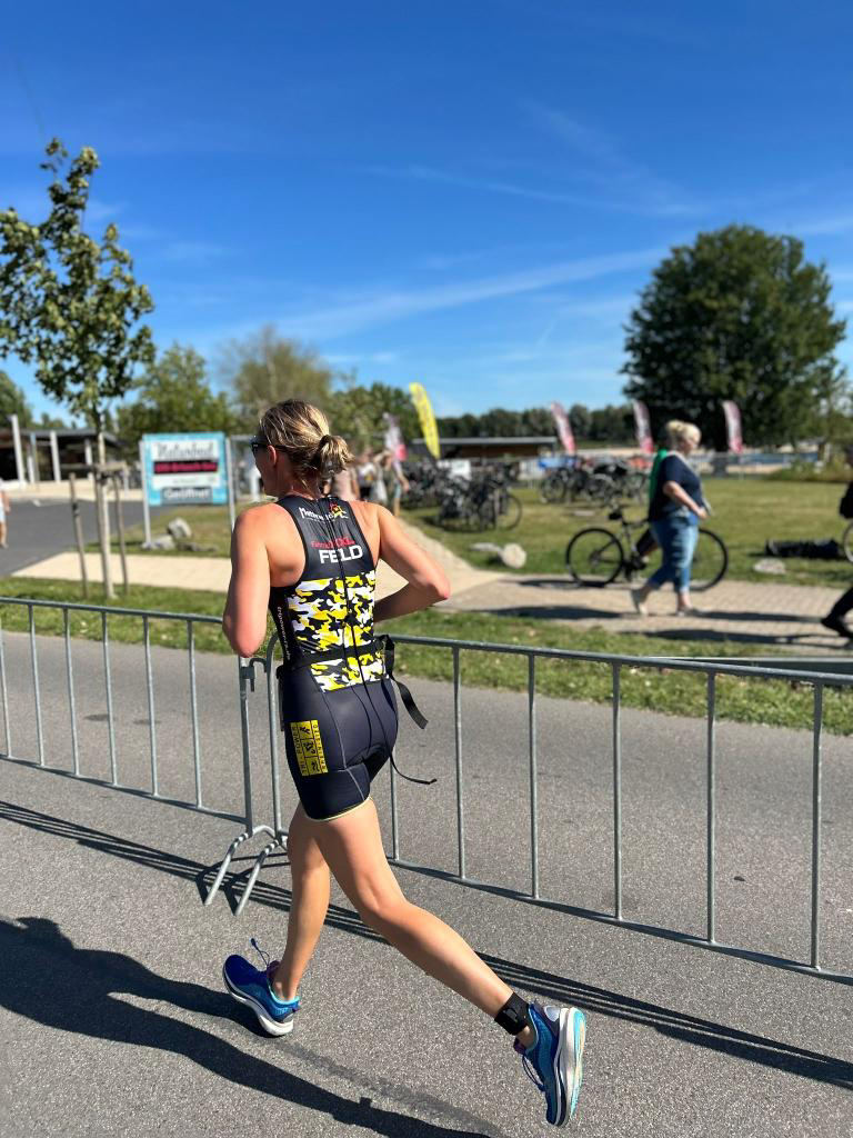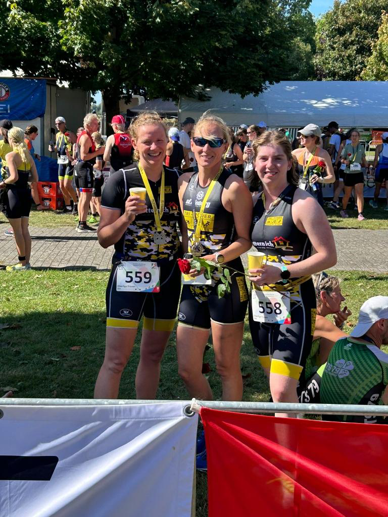 Aufregend war’s schon vor dem Start: Die Anfahrt gestaltete sich aufgrund einiger Sperrungen gar nicht so einfach, so dass unsere Damen zwischenzeitlich nicht mehr ganz sicher waren, ob sie es noch rechtzeitig zum Start schaffen. Greta konnte die Aufregung überhaupt nichts anhaben. Sie stieg nach einem extrem starken Schwimmen auf Position 3 aus dem Wasser! Die zweite Disziplin war dann wie immer Katharinas Stärke – im Mittelfeld aus dem Wasser gekommen konnte sie auf den 17km eine Kontrahentin nach der anderen einsammeln. Auch Kathrin machte sich nach einem durchwachsenen Schwimmen auf dem Rad und später in Laufschuhen daran, noch möglichst viele Plätze gut zu machen.